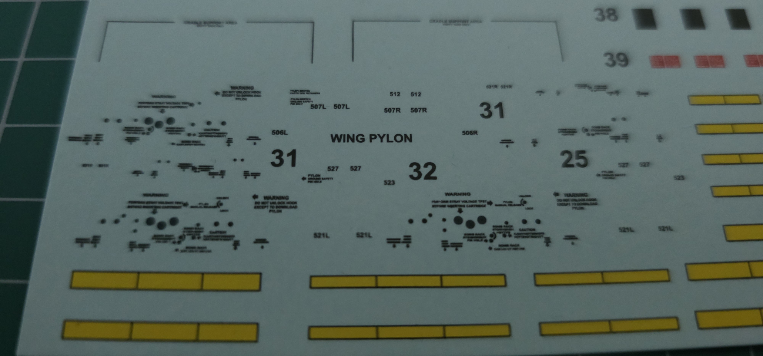기수의 노즈 마킹이 매우 화려한 데칼입니다. 카르토그래프 인쇄로 변경 된 이후로 향상된 품질을 보여 줍니다. 킬마크의 작은 글씨도 어느 정도 알아 볼 수 있는 수준입니다. (mig-23, mig-23, mig-23, mig-29) 데이터 마크의 글씨들도 굵기가 일정하고 깔금하게 인쇄되어 있습니다.