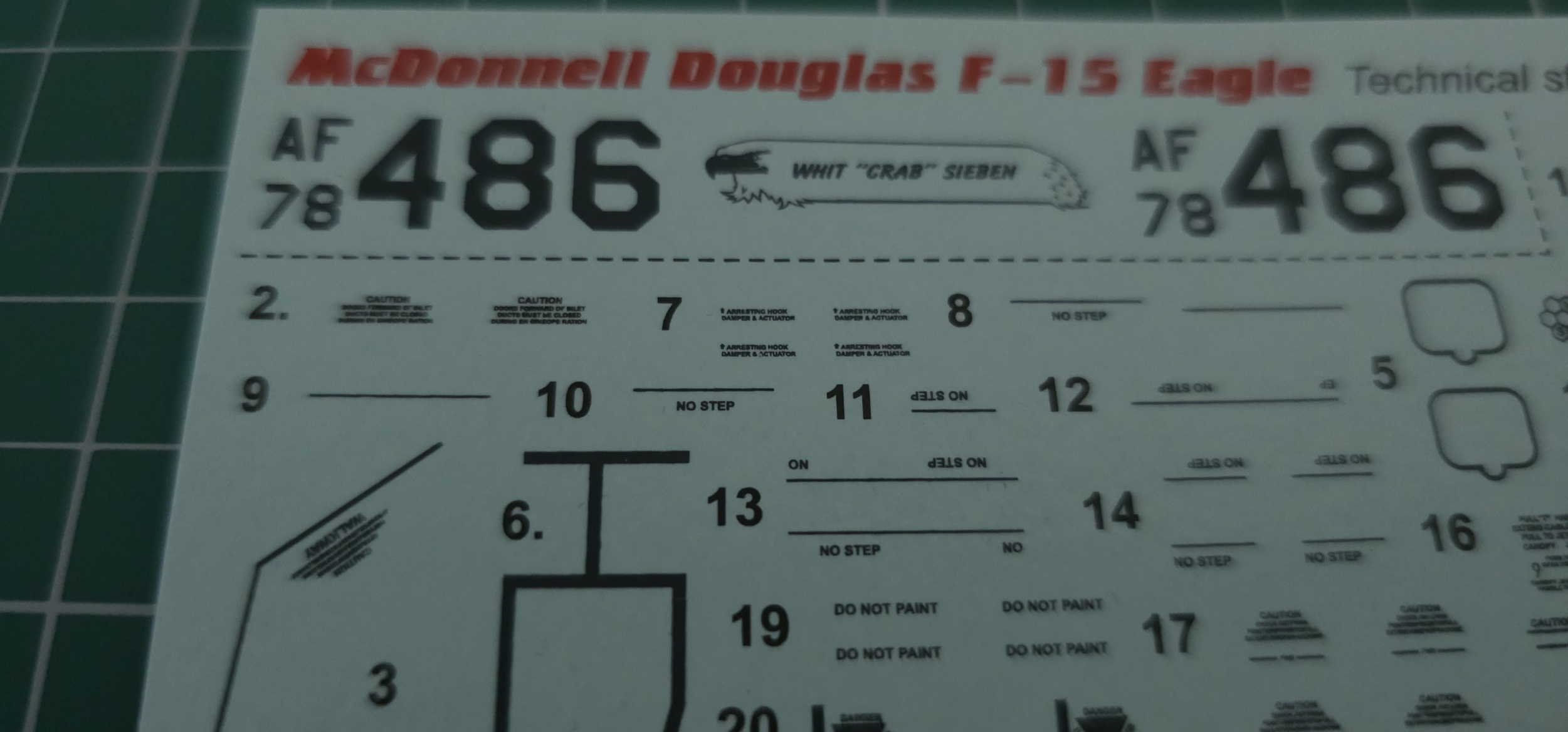 노란색 배경의 데칼 가이드는 F-15 초기의 제공위장인 라이트 고스트 그레이와 다크 고스트 그레이 색상의 기체 데칼 설명이고, 파란 배경은 최신의 MOD Eagle 색상의 F-15 기체 데칼 가이드 입니다.