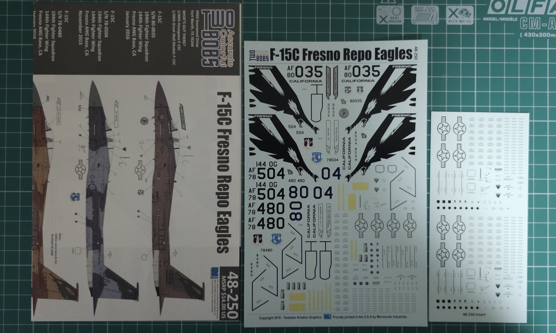 투밥스의 F-15C Frsno repo Eagles 데칼입니다. 얼그랫서 도장이 포함된 데칼입니다. 한 동안 직구로만 국입할 수 있었는데 최근에 투밥스 데칼들이 다시 국내 정식 수입되기 시작해서 국내 모형 쇼핑몰에서 2만원대의 가격으로 구매할 수 있습니다.